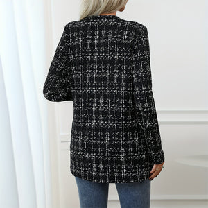 Elevate your transitional wardrobe with this timeless Women's Elegant Black and White Checkered Collarless Jacket. Designed to bridge semi-formal and casual settings with ease, its classic grid print and clean lines offer a polished yet relaxed aesthetic, making it an effortlessly chic layering piece for various occasions.