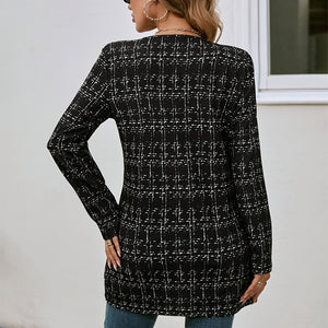 Women's Elegant Black White Checkered Collarless Casual Mid-Length Jacket Versatile For Semi-Formal & Casual Occasions