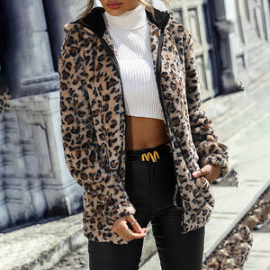 Women's Fuzzy Leopard Jacket, Hooded Plush Zip Up Coat For Fall Winter